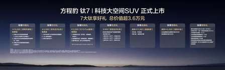 在购车权益上,方程豹更是诚意十足,为首批车主带来了总价值最高超3.6万元的7大钛享好礼!其中包括:覆盖多项座椅舒适配置的总价值10000元舒享升级包、价值 3599元的 BYD Pad套装、价值 4500 元的新车交付礼包均免费送;提供3年0息、5年低息、0首付起或至高 84期等多重金融方案以供选择,金融贴息最高价值 11300 元;还有最高价值6000 元的置换补贴价值 900 元的智慧生态礼包,以及2年 5G 每个月的免费车机流量、非营运车辆长达6年或 15万公里的整车包修、“三电”系统的终身保修、终身免费系统 OTA 升级等,让每一个家庭都能轻松拥抱钛7,让美好生活触手可及。