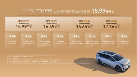 央企严选品质硬,家庭用车更放心。2026款eπ008五座版提供增程、纯电两种动力,超阔版、超尊版两种配置,共计四款产品,限时焕新指导价15.99-17.16万元,还可享受包含金融礼、质保礼、交付礼、选装礼、流量礼等多重上市权益。
