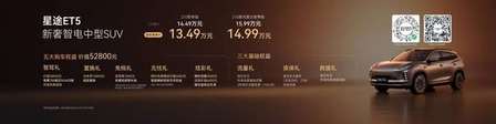 11月28日,在坐拥粤港澳大湾区核心区位的世界级城市珠海,星途汽车正式发布“新奢智电中型SUV”星途ET5。新车共推出210舒享版、210激光雷达智尊版两款配置,官方指导价14.49万元-15.99万元,超级置换价13.49万元-14.99万元以诚意满满的价格回馈用户,并重磅宣布猎鹰700城区NOA功能终身免费使用。价值52800元五大购车权益、三大基础权益下定即享。