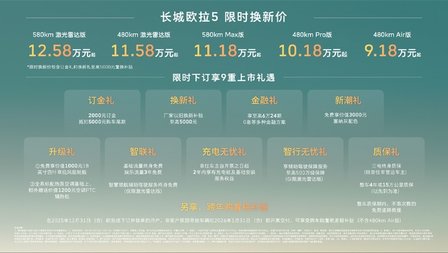 【中国·保定】2025年12月16日——今日,长城汽车欧拉品牌全新A级纯电SUV——长城欧拉5正式上市。新车共推出5款配置,建议零售价区间为 9.98万至13.38万元,限时换新价9.18万元起(限时换新价包含“订金礼”和“换新礼”至高5000元以旧换新补贴)。为回馈广大用户的热爱与支持,即日起至2025年12月31日,用户下订并锁单即可尊享包含订金礼、换新礼、智行无忧礼在内的9重上市好礼,以及跨年购置税补贴(不含480km Air版)等丰厚购车权益。凭借诚意十足的价格权益与越级产品力,长城欧拉5致力于成为全球年轻用户的“严选搭子”。