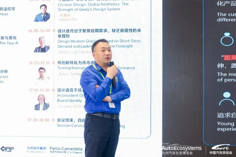 Carlo Bonzanigo先生在《中国新能源汽车设计对全球消费者偏好的适应性》的主题演讲中表示:“在中西方汽车文化与消费是存在明显的差异,西方重视驾控、设计与品牌忠诚,中国重视智能座舱与科技配置。中国新能源车技术与性价比突出,但缺乏清晰品牌身份。建议立足稳定审美体系,打造独特品牌标识,需要通过设计与品牌价值来打动西方市场。”