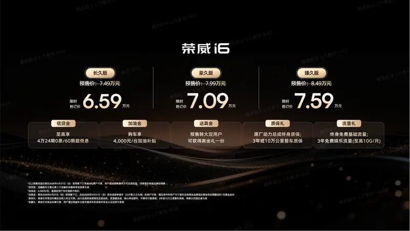 4月13日,国民级家轿荣威i6正式开启预售,共推出三款车型,分别是长久版、豪久版、臻久版,限时抢订价6.59万-7.59万,至高享4万24期0息/60期超低息,4,000元/台加油补贴,原厂动力总成终身质保。预售转大定,在5月底前锁单提车的用户送足金金钞。
