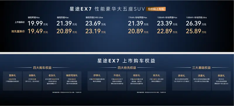 星途EX7提供纯电与增程双动力选择,共推出增程两驱Max、增程四驱Max、增程四驱EMB Ultra以及77kWh 纯电两驱Max、100kWh 纯电两驱Max、100kWh 纯电四驱Ultra六款车型,官方指导价为19.99万元—26.39万元,抢先置换价为19.49万元—25.89万元。与此同时,星途汽车官方还为用户提供了多重购车福利:包括置换礼、金融礼、老友礼、辅助驾驶礼四大购车权益;舒享礼、升级礼、绚彩礼、抢先礼四大抢先礼;此外,首任车主还可享受整车终身质保、终身免费基础流量、终身免费救援礼三大基础权益,让每位用户轻松拥有豪华奢享出行新体验。