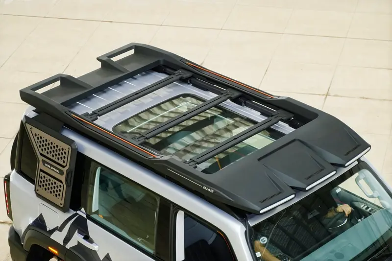 4.三段式车顶射灯则以家族化集成语言嵌入车顶平台前端,无需额外打孔接线,既强化了夜间穿越的照明能力,也赋予了整车更具科技感的正面视觉。